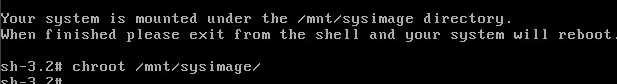 至此,系统已经挂载到了/mnt/sysimage中。接下来回车,输入chroot /mnt/sysimage 进入管理员环境。