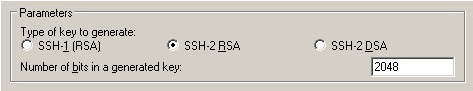 该工具可以生成三种格式的key :SSH-1(RSA) SSH-2(RSA) SSH-2(DSA) ,我们采用默认的格式即 SSH-2(RSA)。Number of bits in a generated key 这个是指生成的key的大小,这个数值越大,生成的key就越复杂,安全性就越高。这里我们写 2048。